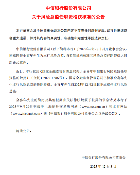 12月3日股票配资正规平台,中信银行股份有限公司发布关于风险总监任职资格获核准的公告,国家金融监督管理总局已核准金喜年先生本行风险总监的任职资格。